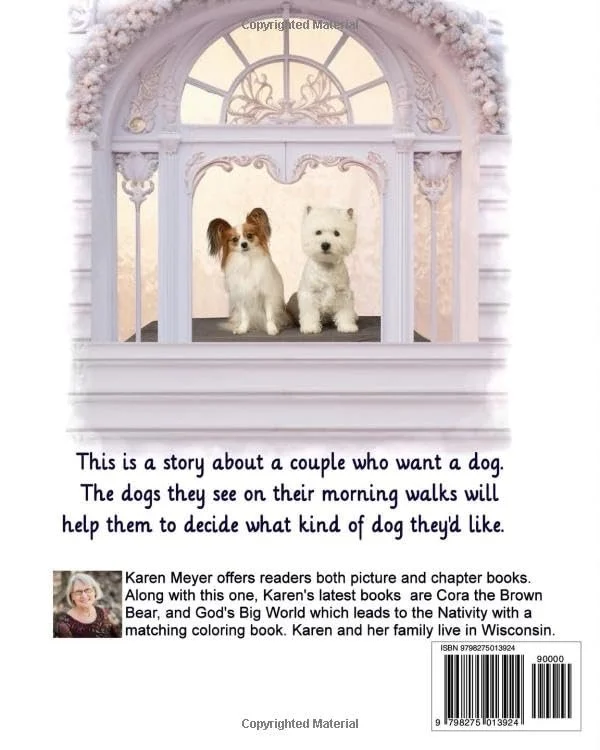 A children's story about a couple who want a dog. The dogs they see on their morning walks will help them decide what kind of dog they'd like.
