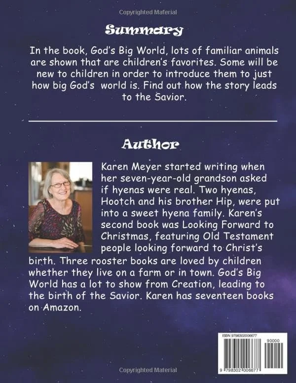 The Creation account is read to two children. One has a question. One has a comment. The story goes on to show favorite animals and some unfamiliar ones. Present day shepherds still take care of sheep just like the shepherds who heard the angel's announcement of the birth of the Savior. For God so loved His Big World.