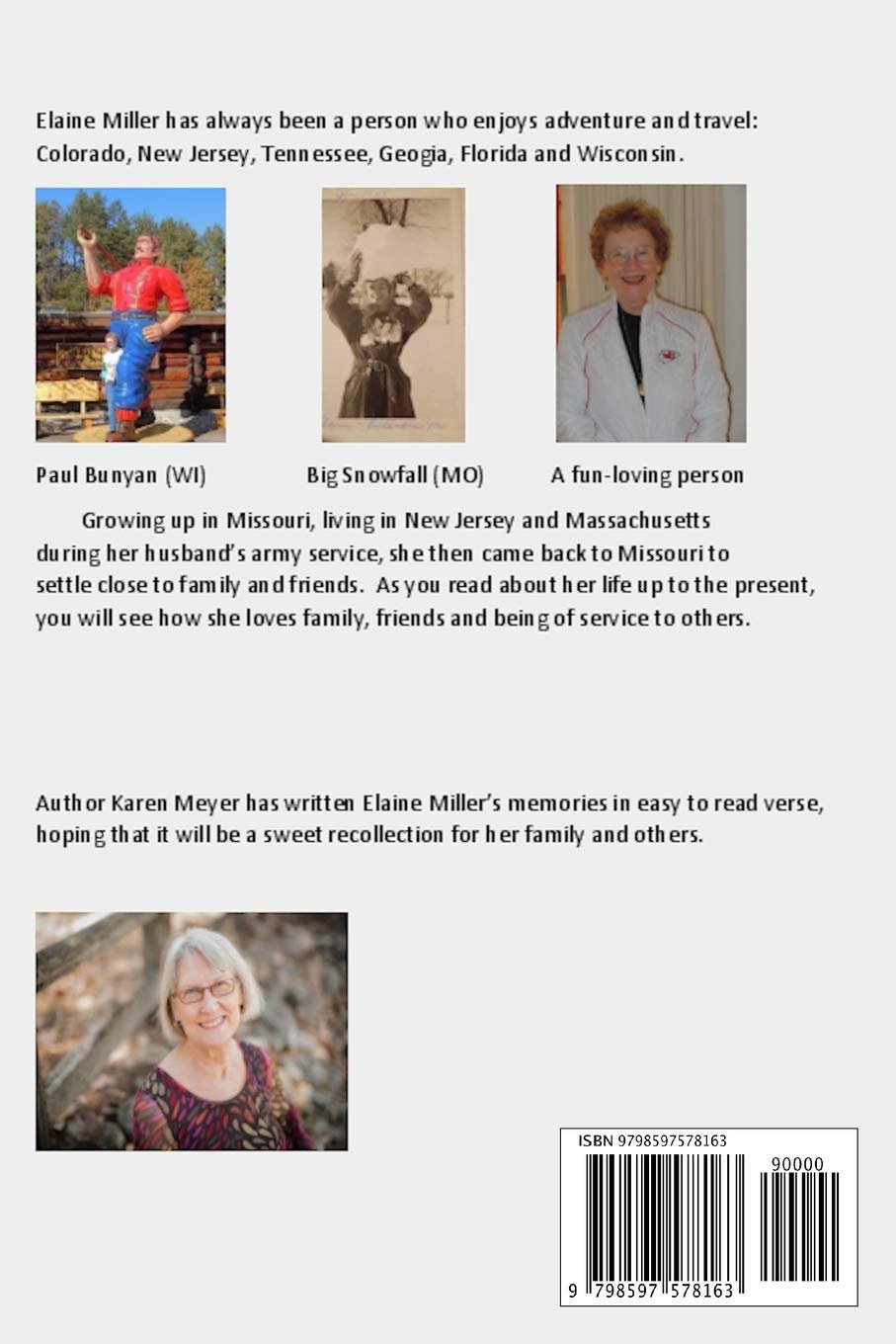 She was born in 1935 near Aullville, Missouri, where it is said that outlaw Jesse Woodson James hid out in the past. This book, called My Story, written in verse, takes Elaine Ivy Miller from her birth on a small farm without electricity or running water, to her move to the nearby small town, to grade school, high school, marriages, children, and to the present. Read how she remembers these years.